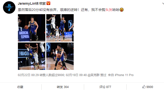 后期林书豪参加发展联盟的比赛,也被球迷们吐槽头发太长了,可以剪发了,而林书豪当时的复出之后带队拿下了一场超级逆转,随后发文:“虽然落后20分却没有放弃,艰难的逆转!还有,我不会剪头发哈哈”这也获得了好友吴克群等人的点赞支持。