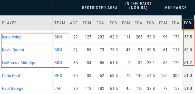 谁是本赛季中投之王?保罗51%命中率位居第四,篮网队包揽前三名