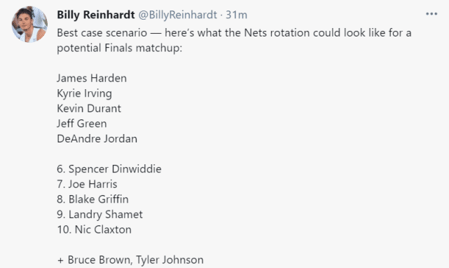 篮网跟队记者Billy Reinhardt预测了丁威迪复出后的篮网最佳轮换,并表示一旦篮网打进总决赛,这可能就是到时候的阵容——