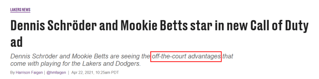 这就是洛杉矶吸引球星的一个地方。在这儿打球,能够获得更高的曝光度,当然也意味着更多的场外收入机会。当初,浓眉刚加盟湖人时,就签下不少广告代言,如今,施罗德也获得了类似的福利。