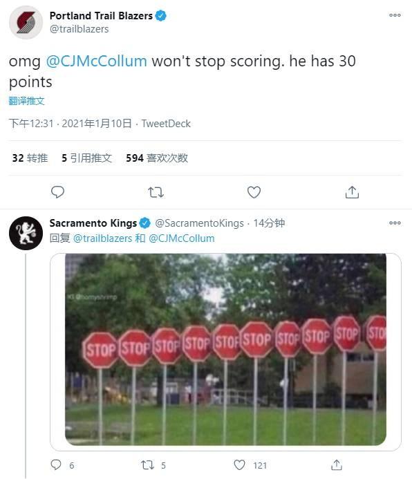对于麦科勒姆的疯狂砍分,开拓者官方狂吹麦科勒姆根本停不下来,结果国王官方回应:停停停停停停停停!
