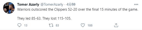名记Tomer Azaly发推写道快船一度85-63领先22分,最终105-115输给勇士,勇士本场比赛最后15分钟狂砍52-20攻击波狂赢快船32分;昔日有路威带领快船31分大逆转勇士,如今库里带队22分逆转快船,而且是击败拥有小卡和乔治两大巨星的快船。