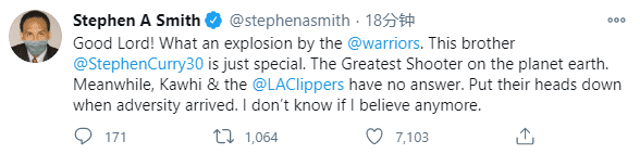 美国杨毅A-史密斯发推:上帝啊!勇士“炸弹级”的表现!库里就是很特别,这个星球上最伟大的射手。与此同时莱昂纳德和他的快船队没有做出任何回应。当敌人进军时,他们低下了头;我不知道我能否再相信他们了。
