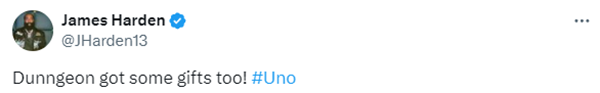 哈登还发推晒出多张对阵骑士的赛场照,配文写道:昨晚,祖巴茨的生日派对太热闹了;晒自己背后大帽对手时与邓恩同框照,写道:邓恩也收到了一些生日礼物。