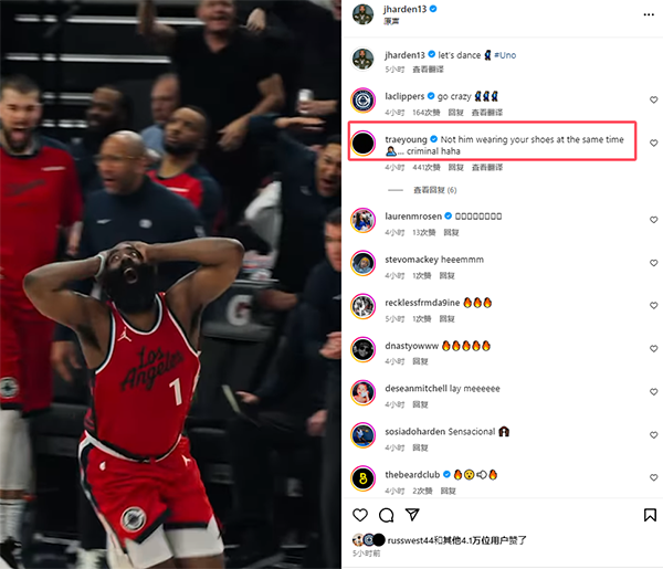 今日哈登通过社媒晒出自己戏耍莫布利以及双手抱头庆祝的画面,配文写道:让我们一起跳舞吧;威少、特雷-杨为哈登点赞,杨更是在评论区写道:这简直就是犯罪,哈哈。