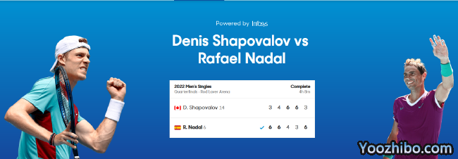 1/4决赛,纳达尔的对手是赛会14号种子、22岁的加拿大小将沙波瓦洛夫,这是后者连续第4年参加澳网男单正赛,也是首次打进1/4决赛。前四轮,他分别以3-1战胜塞尔维亚选手杰雷,3-2逆转韩国选手权纯雨,3-1淘汰赛会23号种子、美国选手奥佩尔卡,3-0横扫赛会3号种子、德国选手A-兹维列夫,可以说一场比一场打得好。