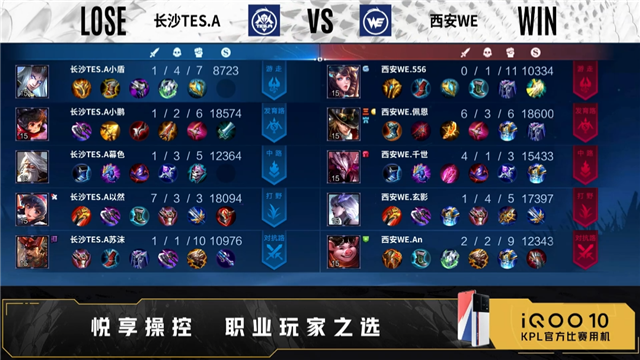 开局中路长沙TES.A三人抢线。1分01秒野区西安WE击杀明世隐,拿下一血,打出0换2。2分31秒河道团战长沙TES.A击杀铠,西安WE打出1换3。3分35秒中路长沙TES.A击杀沈梦溪,拿下暴君,打出1换1。5分08秒长沙TES.A摧毁敌方对抗路外塔,西安WE摧毁敌方发育路外塔。5分41秒长沙TES.A拿下主宰。6分22秒中路长沙TES.A击杀关羽,西安WE摧毁敌方中路外塔。7分23秒西安WE摧毁敌方对抗路外塔,摧毁中路二塔。8分14秒西安WE摧毁敌方对抗路二塔,9分39秒拿下暴君。9分51秒河道团战西安WE击杀不知火舞,打出2换3。11分32秒西安WE拿下暗影暴君,12分13秒拿下暗影主宰。13分05秒对抗路团战长沙TES.A击杀蒙犽,双方打出1换1。15分04秒长沙TES.A摧毁敌方发育路二塔、中路外塔,西安WE拿下暗影暴君。16分43秒西安WE拿下暗影主宰。17分53秒西安WE摧毁敌方发育路二塔,发育路团战打出1换2。19分54秒西安WE摧毁敌方发育路高地,中路击杀夏侯惇。20分41秒西安WE拿下风暴龙王。21分37秒西安WE摧毁敌方中路高地、对抗路高地,打出0换5,团灭对手摧毁水晶拿下比赛。