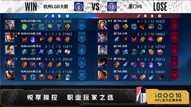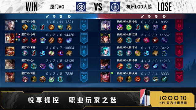第一局杭州LGD大鹅东皇太一开局对抗路抢线。4分30秒发育路团厦门VG打出0换2。4分56秒厦门VG拿下暴君。5分47秒双方互换边路外塔。7分52秒厦门VG摧毁敌方对抗路外塔。9分钟杭州LGD大鹅拿下先知主宰。9分54秒厦门VG拿下暴君。10分钟厦门VG中路击杀阿古朵。10分33秒厦门VG拿下暗影主宰。10分42秒厦门VG摧毁敌方对抗路二塔,团战杭州LGD大鹅击杀太乙真人。11分12秒杭州LGD大鹅摧毁敌方发育路外塔,随后拿下暗影暴君。12分45秒中路团厦门VG打出1换2。14分17秒厦门VG拿下暗影主宰。14分53秒厦门VG摧毁敌方中路外塔、发育路二塔。15分42秒厦门VG拿下暗影暴君。17分10秒对抗路团厦门VG打出0换2。17分37秒厦门VG野区击杀李元芳。18分09秒厦门VG摧毁敌方中路二塔,随后拿下暗影主宰。19分34秒厦门VG高地处击杀马超,随后摧毁敌方对抗路高地塔。20分16秒厦门VG拿下风暴龙王。20分39秒厦门VG摧毁敌方发育路高地塔,21分12秒厦门VG摧毁敌方中路高地塔。22分17秒厦门VG高地处击杀阿古朵。22分38秒厦门VG摧毁敌方水晶拿下比赛。