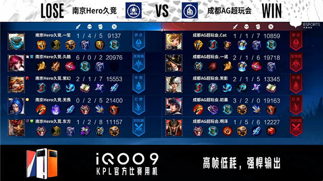 开局成都AG边路换线。53秒南京Hero发育路击杀蒙恬拿到一血。2分13秒南京Hero拿下暴君。4分04秒南京Hero拿下主宰。4分37秒南京Hero主宰处击杀娜可露露。4分56秒南京Hero野区击杀嬴政。5分07秒南京Hero中路击杀蒙恬。8分44秒南京Hero拿下主宰。9分整双方中路1换1,成都AG摧毁敌方发育路二塔。10分33秒成都AG抢到暗影主宰。11分56秒南京Hero拿下暗影暴君。13分17秒南京Hero中路击杀马可波罗并摧毁中路二塔。15分14秒南京Hero拿下暗影主宰。16分51秒南京Hero拿下暗影暴君。17分54秒成都AG中路击杀橘右京。19分整中路团战双方1换1。19分20秒成都AG拿下暗影主宰。20分15秒成都AG摧毁敌方对抗路二塔。20分36秒成都AG摧毁敌方对抗路高地塔。21分38秒中路团战成都AG击杀盾山。22分33秒成都AG拿下风暴龙王。23分04秒成都AG摧毁敌方发育路高地塔。23分52秒高地团战成都AG击杀盾山。24分03秒高地团战双方1换1。28分02秒成都AG摧毁敌方水晶拿下比赛。