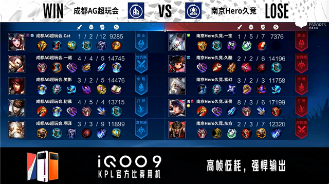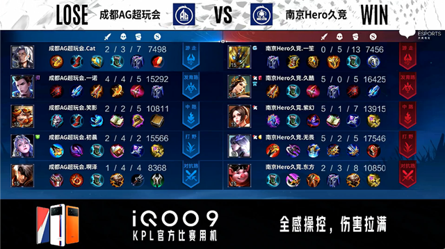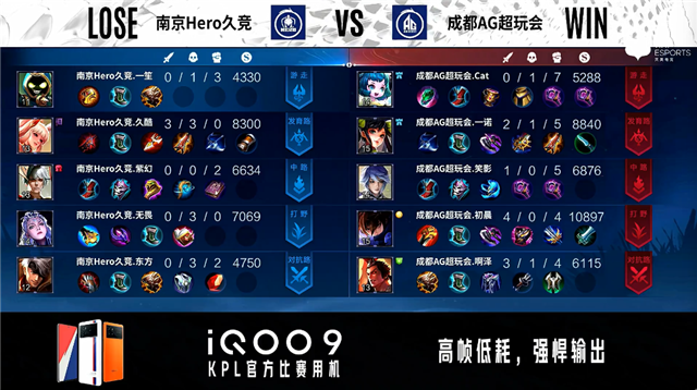 双方常规开局,1分57秒成都AG对抗路击杀露娜拿到一血。2分40秒成都AG对抗路击杀夏侯惇。3分07秒南京Hero拿下暴君。3分36秒成都AG拿下暴君。4分30秒南京Hero发育路打出0换2并摧毁敌方发育路外塔。7分03秒成都AG澜野区单杀公孙离。8分44秒成都AG拿下暴君。9分04秒成都AG摧毁敌方发育路二塔,野区团战成都AG打出1换3。10分24秒成都AG拿下暗影主宰。11分03秒中路团战成都AG击杀露娜。11分43秒成都AG摧毁敌方水晶拿下比赛。