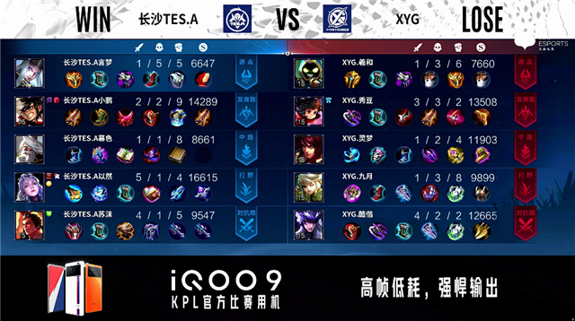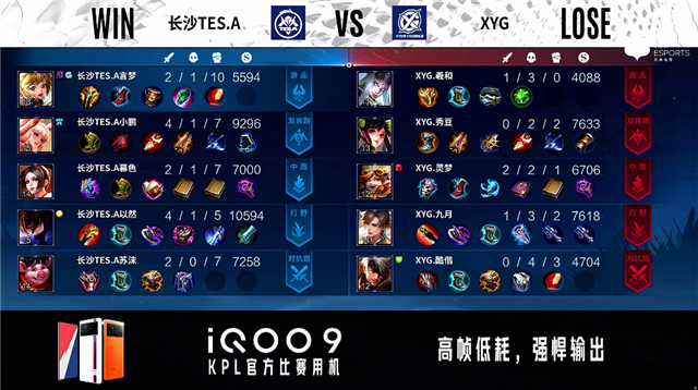 1分39秒,长沙TES.A镜击杀西施拿下一血。3分钟,下路团,XYG打出0换2。4分06秒,长沙TES.A王昭君下路击杀老夫子。4分38秒,长沙TES.A控下暴君,随后XYG拿下先知主宰。6分08秒,双方团,长沙TES.A打出1换2。7分20秒,长沙TES.A破掉XYG中一塔,随后XYG破掉长沙TES.A下一塔。8分58秒,XYG控下暴君,随后长沙TES.A控下先知主宰。10分14秒,双方团,长沙TES.A打出0换2。11分25秒,长沙TES.A破掉XYG上二塔。11分39秒,长沙TES.A破掉XYG中二塔。11分59秒,长沙TES.A破掉XYG下二塔。12分50秒,长沙TES.A控下暗影暴君。14分05秒,长沙TES.A击杀蒙恬。15分33秒,长沙TES.A控下暗影主宰。16分33秒,长沙TES.A破掉XYG上高地。17分15秒,长沙TES.A先后破掉XYG下、中高地。17分36秒,长沙TES.A控下暗影暴君。18分50秒,长沙TES.A击杀蒙恬。19分28秒,长沙TES.A边团边拆摧毁XYG水晶赢下比赛。