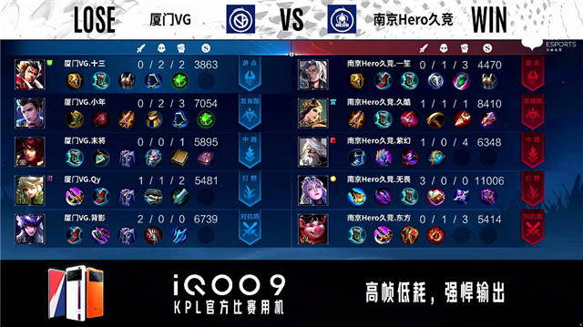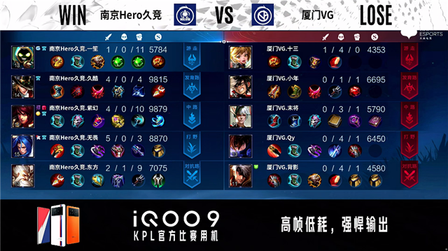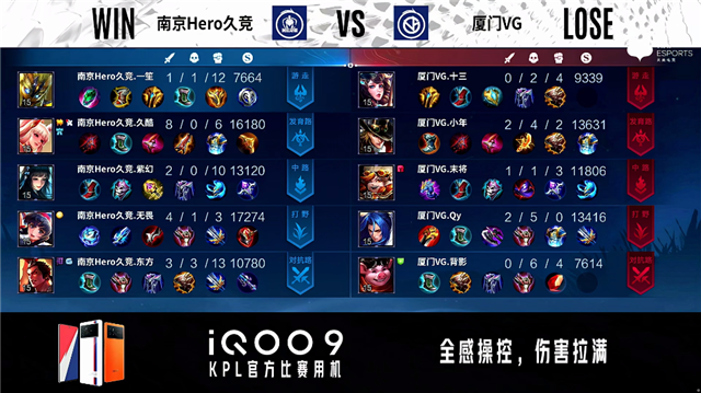 2分06秒,上路团,南京Hero久竞打出0换2。2分34秒,南京Hero久竞控下暴君。2分59秒,南京Hero久竞橘右京击杀夏侯惇。4分08秒,南京Hero久竞马可波罗下路击杀孙膑。6分05秒,南京Hero久竞下路打出0换2。6分34秒,南京Hero久竞破掉厦门VG下二塔。7分20秒,南京Hero久竞击杀孙膑。7分40秒,南京Hero久竞破掉厦门VG中一塔并打出0含3。8分钟,南京Hero久竞破掉厦门VG上二塔。9分10秒,南京Hero久竞控下先知主宰。9分58秒,南京Hero久竞破掉厦门VG中二塔。10分22秒,南京Hero久竞同时控下暗影暴君与暗影主宰。10分58秒,南京Hero久竞破掉厦门VG下高地,随后团战南京Hero久竞打出1换5团灭对手。11分20秒,南京Hero久竞一波摧毁厦门VG水晶赢下比赛。