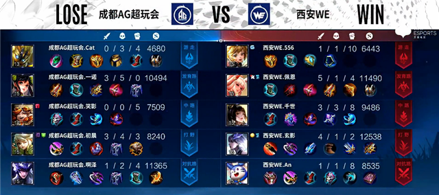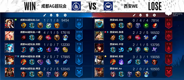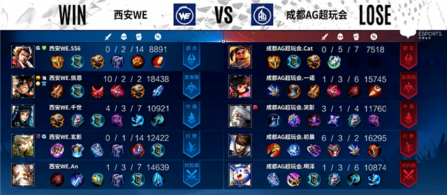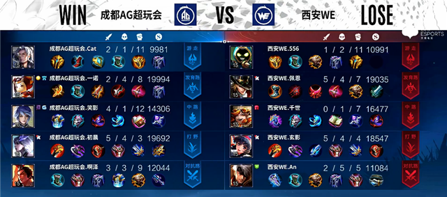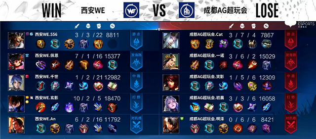 1分20秒河道团战,牛魔拿下一血,西安WE打出0换2。3分44秒露娜拿下主宰。4分钟澜拿下暴君。5分50秒虞姬推掉下路一塔。6分26秒野区团战,西安WE打出1换5团灭成都AG超玩会并推掉中路一塔。8分25秒野区团战,西安WE打出0换2。9分钟露娜拿下暴君,澜拿下主宰。10分钟中路团战,西安WE打出2换3。10分50秒澜抢下主宰,团战成都AG超玩会打出1换2。12分30秒澜拿下暴君。1分30秒野区团战,西安WE打出1换2。15分钟中路团战,牛魔被击杀。15分30秒露娜拿下主宰。16分10秒野区团战,西安WE打出0换3。16分54秒李元芳推掉中路高地塔。18分50秒下路团战,西安WE打出0换2。19分40秒高地团战,西安WE打出0换2。20分20秒澜拿下风暴龙王。20分50秒高地团,双方2换2。21分43秒西安WE推掉水晶追回一分。