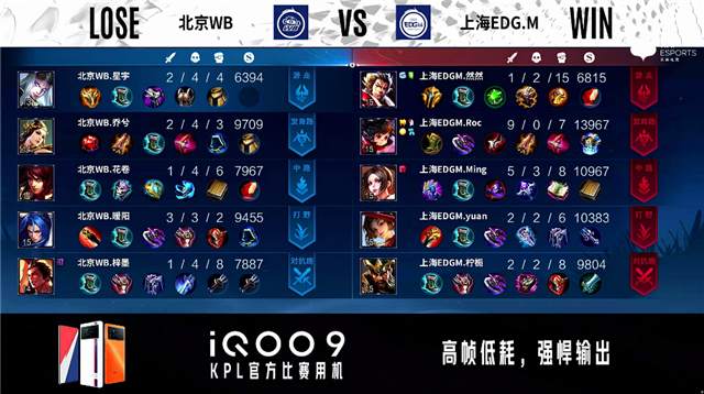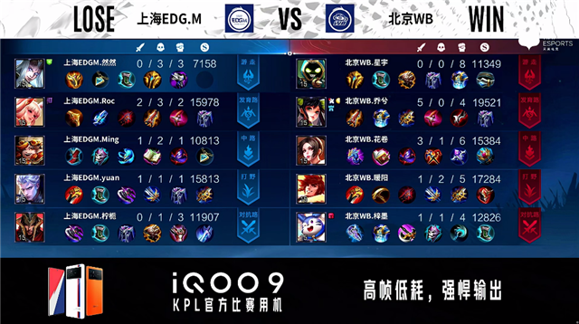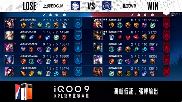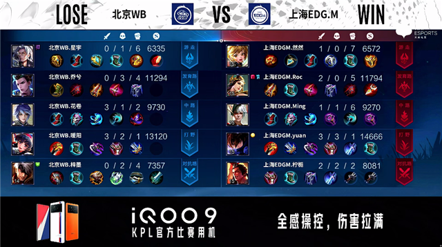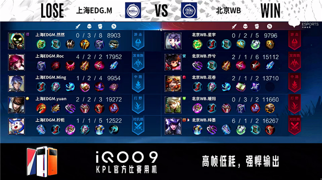 2分20秒,上海EDG.M控下暴君。2分30秒,北京WB不知火舞中路单杀沈梦溪拿下一血。3分07秒,中路团,北京WB打出0换2。5分22秒,北京WB控下先知主宰。5分54秒,上海EDG.M破掉北京WB下一塔。8分钟,北京WB控下暴君并破掉上海EDG.M下一塔。8分57秒,双方团战1换1。9分30秒,北京WB破掉上海EDG.M上一塔,随后控下先知主宰。11分20秒,北京WB控下暗影主宰。12分20秒,北京WB破掉上海EDG.M下二塔。12分58秒,北京WB破掉上海EDG.M中一塔,随后控下暗影暴君。13分47秒,北京WB破掉上海EDG.M上二塔。14分54秒,北京WB破掉上海EDG.M中二塔。15分10秒,北京WB控下暗影主宰。16分23秒,北京WB破掉上海EDG.M上高地。17分08秒,北京WB控下暗影暴君。17分23秒,北京WB不知火舞强开团打出2换2并破掉上海EDG.M下高地。18分56秒,北京WB控下暗影主宰。19分33秒,北京WB破掉上海EDG.M中高地。21分46秒,北京WB控下风暴龙王。22分30秒,双方团,北京WB打出0换4,随后点掉上海EDG.M水晶赢下比赛。