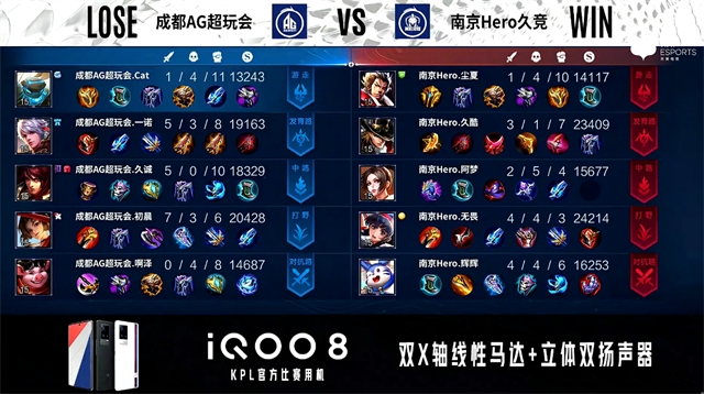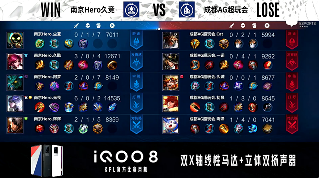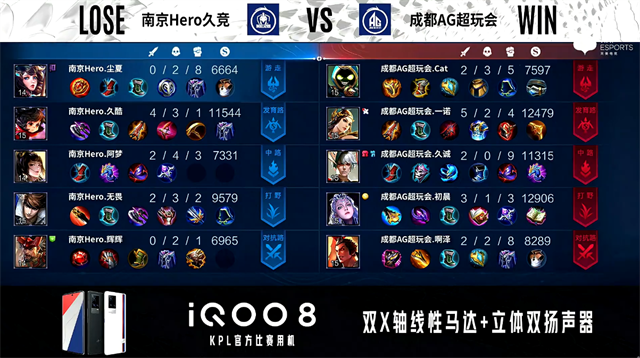 双方常规开局。1分21秒南京Hero拿下中路河道之灵。2分05秒成都AG对抗路击杀云缨拿到一血。2分27秒成都AG拿下主宰。3分37秒双方中路1换1。4分19秒南京Hero拿下暴君。6分56秒成都AG抢到主宰。7分35秒成都AG对抗路击杀云缨。7分37秒南京Hero中路击杀嫦娥。8分43秒成都AG拿下暴君。10分20秒成都AG拿下暗影主宰。10分38秒南京Hero野区击杀嫦娥。11分14秒南京Hero拿下暗影暴君。11分59秒成都AG野区击杀橘右京。12分40秒中路团战成都AG打出1换3。13分08秒成都AG团灭对手摧毁水晶拿下比赛。