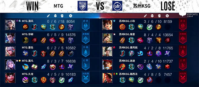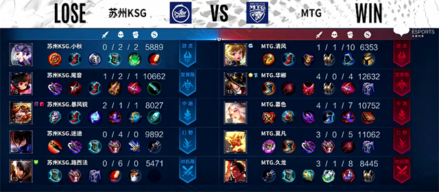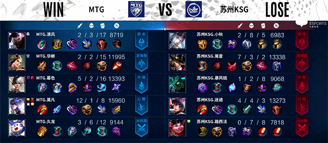 开局MTG入侵野区,露娜拿下一血,团战双方2换2。2分30秒露娜拿下暴君,团战苏州KSG打出3换4,吕布拿下三杀。3分40秒狄仁杰被击杀。4分钟虞姬推掉下路一塔。4分20秒露娜拿下主宰。4分40秒河道团战,苏州KSG打出0换2。5分50秒狄仁杰推掉下路一塔。6分10秒野区团战,苏州KSG打出1换3。7分10秒下路团战,双方2换2。7分45秒露娜拿下暴君。8分45秒刘禅被击杀。11分06秒狄仁杰拿下暴君,吕布被击杀。12分33秒露娜拿下主宰。团战苏州KSG打出2换3。13分40秒下路团战,双方2换2。15分钟野区团战,虞姬被击杀。15分45秒露娜拿下暴君。16分20秒野区团战,双方2换2。17分钟露娜拿下主宰。18分钟狄仁杰推掉上路高地塔。18分36秒MTG推掉水晶拿下本场比赛胜利。