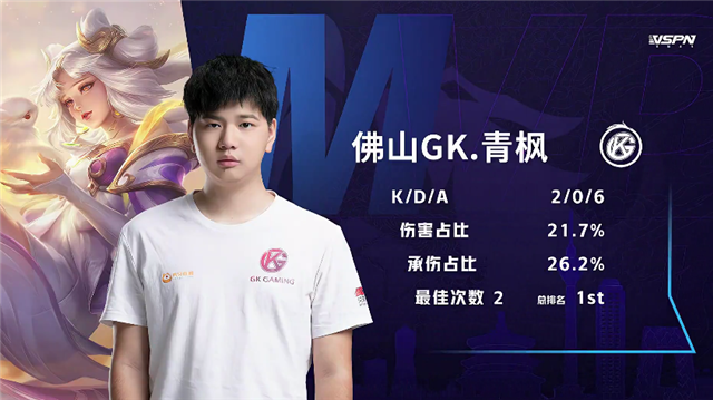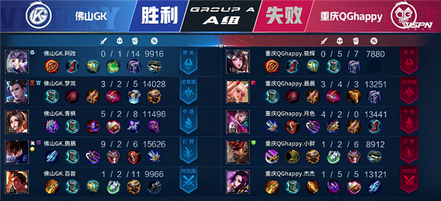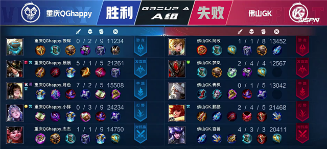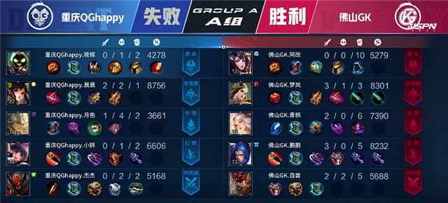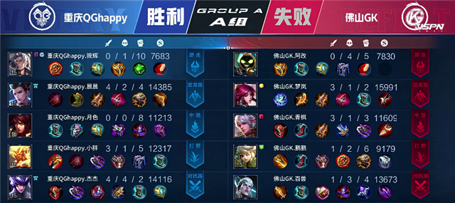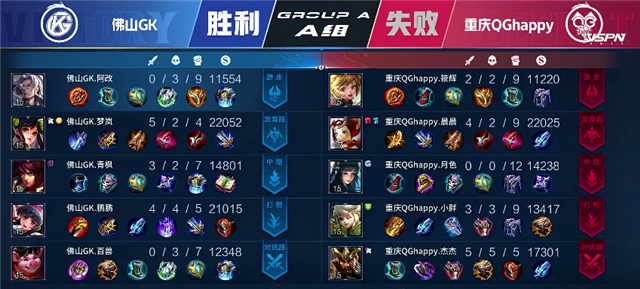 开局双方中路抢视野,嫦娥拿下一血,橘右京反下蓝buff。2分30秒佛山GK拿下暴君。3分钟重庆QG下路越塔强杀,双方打出1换1。4分10秒佛山GK推掉上路一塔,4分15秒拿下主宰。4分48秒橘右京反下蓝buff。5分钟佛山GK强推中路一塔和二塔,张良被击杀。6分钟佛山GK拿下暴君。6分50秒娜可露露推掉下路一塔。7分钟佛山GK推掉上路二塔。8分30秒佛山GK强攻下路二塔,团战打出1换2,佛山GK推掉下路二塔。8分52秒佛山GK推掉下路高地塔。9分30秒佛山GK拿下主宰。9分58秒下野区团战,佛山GK一波团灭重庆QG。10分35秒佛山GK速破水晶拿下本场比赛胜利。