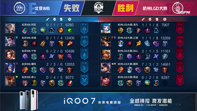 1分45秒,北京WB下路越塔打出0换2,马超拿下双杀。2分45秒,杭州LGD拿下暴君。2分57秒,杭州LGD下路击杀马超。3分16秒,北京WB沈梦溪击杀太乙真人。4分29秒,中路团,杭州LGD打出0换2。5分钟,杭州LGD拿下主宰。5分21秒,北京WB破掉杭州LGD下一塔。6分50秒,杭州LGD露娜击杀孙膑。8分33秒,北京WB中路打出0换2。8分53秒,北京WB破掉杭州LGD中一塔。9分20秒,北京WB破掉杭州LGD上二塔,随后马可波罗1v2拿下双杀。11分13秒,北京WB拿下黑暗暴君。12分20秒,北京WB打退杭州LGD后破掉其下二塔。13分15秒,野区团,杭州LGD打出0换4,孙尚香与露娜拿下双杀。13分50秒,杭州LGD陆续破掉北京WB上、中二塔,随后控下主宰。16分22秒,双方团战1换1。17分53秒,杭州LGD拿下黑暗暴君。20分57秒,双方团,杭州LGD打出0换2并控下风暴龙王。22分36秒,杭州LGD破掉北京WB中高地。23分钟,杭州LGD破掉北京WB下高地。24分30秒,中路团,杭州LGD打出0换3。24分53秒,杭州LGD破掉北京WB水晶2:0拿下比赛。