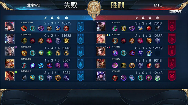 1分54秒双方团战1换1,2分20秒北京WB抢下暴君,4分06秒上路团,双方1换1。5分钟MTG拆掉北京WB上路一塔,8分钟MTG拿下暴君,8分44秒中路团战XYG打出2换3,拆掉北京WB中路一塔。8分52秒中路团XYG打出1换2拆掉北京WB中路二塔,10分钟MTG击杀娜可露露。11分21秒MTG拿下暗影暴君,12分30秒MTG拿下暗影主宰。14分13秒MTG拆掉北京WB上路高地,15分04秒MTG拿下暗影暴君。16分46秒MTG拿下暗影主宰,17分钟团战MTG打出0换4,带领兵线一波拆掉北京WB水晶。