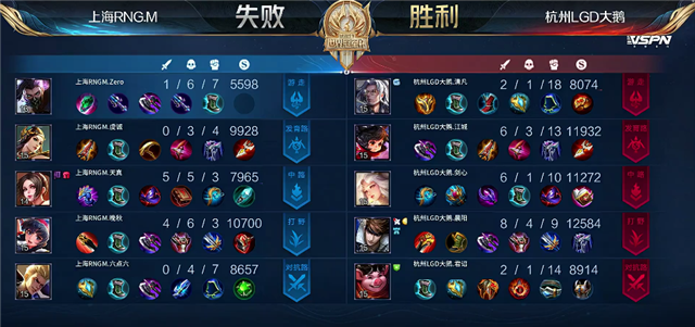 1分钟中路河道之灵团战,不知火舞拿下一血。1分45秒不知火舞被击杀。2分30秒暴君团杭州LGD大鹅打出1换2,猪八戒拿下暴君。2分45秒中路团战,嫦娥被击杀。3分钟娜可露露被击杀。4分30秒杭州LGD大鹅强攻中路一塔,团战杭州LGD大鹅打出0换2,杭州LGD大鹅推掉中路一塔。5分钟赵云入侵野区被不知火舞击杀。6分32秒中路团战,杭州LGD大鹅打出3换4。7分20秒赵云拿下暴君。8分50秒上海RNG.M下路一塔被破。10分26秒兰陵王拿下主宰。10分35秒娜可露露推掉上路一塔。11分钟野区团战,杭州LGD大鹅打出2换4。13分20秒中路团战,杭州LGD大鹅打出1换3。14分30秒赵云拿下主宰。15分10秒赵云拿下暴君。15分40秒上路团战,杭州LGD大鹅团灭上海RNG.M。16分04秒杭州LGD大鹅推掉水晶拿下本场比赛胜利。