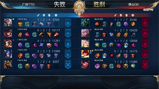 0分58秒,广州TTG打出0换2,不知火舞拿下双杀。2分钟,佛山GK下路越塔打出0换2。2分21秒,佛山GK拿下暴君。3分02秒,广州TTG中路击杀嫦娥。4分38秒,上路2v2,广州TTG击杀裴擒虎。5分17秒,佛山GK拿下先知主宰。6分27秒,佛山GK破掉广州TTG上二塔。7分48秒,佛山GK破掉广州TTG中一塔。8分17秒,双方团,佛山GK打出2换3,随后破掉广州TTG中二塔。9分42秒,佛山GK破掉广州TTG下二塔。10分21秒,佛山GK拿下暗影暴君。11分14秒,佛山GK拿下暗影主宰,随后击杀不知火舞。12分15秒,佛山GK下路击杀橘右京。12分42秒,双方团战1换1。15分39秒,佛山GK拿下暗影主宰。16分36秒,佛山GK破掉广州TTG上高地。17分16秒,佛山GK先后破掉广州TTG中、下高地并击杀李元芳。18分02秒,佛山GK一波摧毁广州TTG水晶。