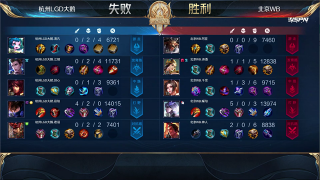 3分06秒,北京WB拿下暴君。3分25秒,杭州LGD破掉北京WB下一塔。5分50秒,杭州LGD破掉北京WB上一塔。6分34秒,中路团,北京WB打出1换3,镜拿下双杀。10分25秒,双方团战1换1。11分03秒,北京WB拿下暗影主宰。11分30秒,杭州LGD破掉北京WB中一塔,随后团战杭州LGD打出1换2,澜拿下双杀。12分44秒,杭州LGD拿下暗影暴君。14分45秒,杭州LGD破掉北京WB下二塔。15分24秒,北京WB拿下暗影主宰。17分08秒,野区团,北京WB打出0换3,随后陆续破掉杭州LGD中路三塔。17分45秒,再次击杀一人后北京WB一波摧毁杭州LGD水晶。