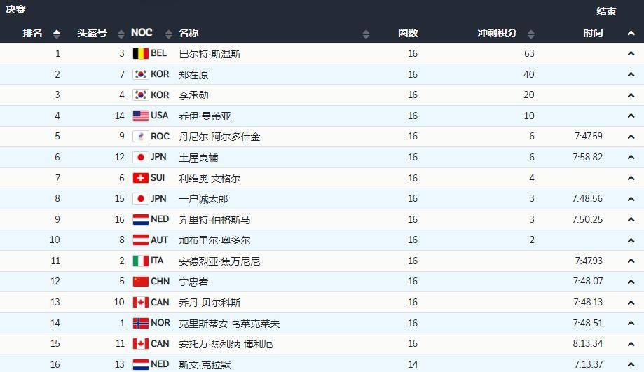 优直播讯 2月19日讯 冬奥会速度滑冰男子集体出发决赛,中国选手宁忠岩出战,最终排名第12。