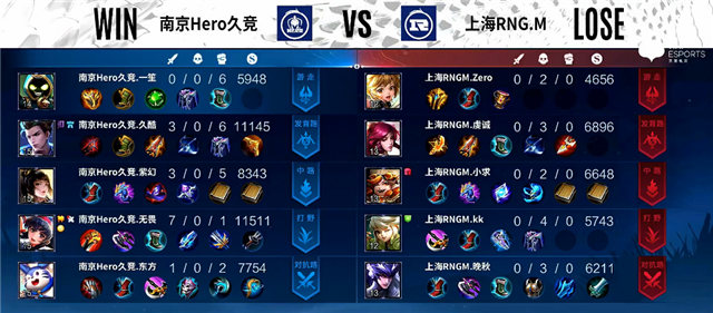 2分15秒橘右京拿下暴君,镜拿下一血,双方1换1。4分钟弈星被击杀。5分钟镜拿下主宰。6分47秒镜拿下暴君。7分钟虞姬推掉下路一塔。7分24秒中路团战,双方1换1。8分钟橘右京被击杀。10分27秒镜拿下暴君。11分20秒上路团战,南京Hero久竞打出0换2。11分52秒南京Hero久竞推掉上路高地塔。13分40秒吕布被击杀。14分钟镜拿下暴君。14分40秒中路团战,南京Hero久竞打出0换2。15分04秒南京Hero久竞推掉水晶率先拿下赛点。