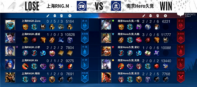 3分15秒中路交火,马可波罗拿下一血。3分30秒露娜拿下暴君,澜拿下主宰。5分钟李元芳推掉下路一塔。7分33秒瑶被击杀。8分钟李元芳推掉中路一塔。8分17秒露娜拿下暴君。8分32秒野区团战,露娜拿下三杀。8分59秒姜子牙推掉中路高地塔。9分40秒野区团战,南京Hero久竞团灭上海RNG.M。10分09秒南京Hero久竞推掉水晶率先拿下一分。