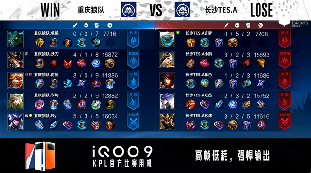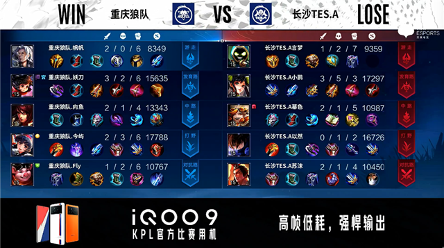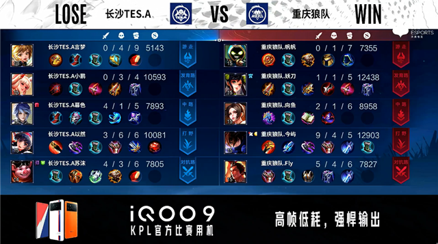 1分11秒中路团战重庆狼队打出2换4。2分25秒长沙TES.A发育路击杀孙尚香。对抗路双方1换1。3分34秒重庆狼队对抗路打出1换2。5分47秒重庆狼队对抗路击杀娜可露露。7分58秒长沙TES.A拿下暴君。8分20秒中路团战双方2换2。9分30秒重庆狼队发育路击杀娜可露露。10分18秒重庆狼队拿下暗影主宰。10分30秒长沙TES.A拿下暗影暴君。12分40秒重庆狼队中路越塔打出1换2。13分29秒双方中路1换1,重庆狼队摧毁敌方中路外塔。14分12秒野区团战重庆狼队打出0换3。14分47秒重庆狼队摧毁敌方水晶拿下比赛。