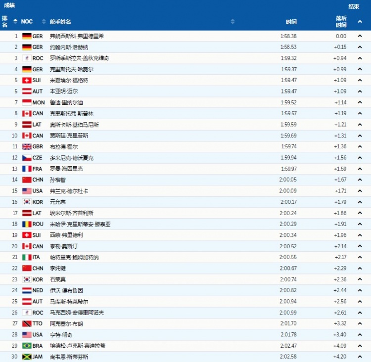 优直播讯北京时间2月14日,2022北京冬奥会继续进行,国家雪车雪橇中心在晚上举行了男子双人雪车前两轮的比赛,德国两组合包揽前两名,中国组合孙楷智/吴青泽排名第14位,李纯键/刘蔚组合排名第22位。
