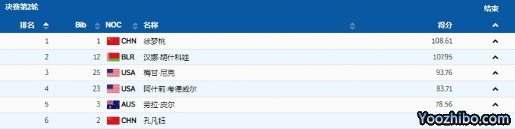 优直播 2月14日讯 冬奥会自由式滑雪女子空中技巧决赛的第2轮正在进行,中国选手徐梦桃、孔凡钰在决赛第1轮中以第二、三晋级。第二轮决赛仅有一跳的机会。