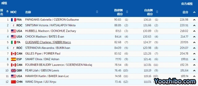 优直播讯2月14日讯 2022年北京冬奥会在首都体育馆进入到正赛第10个比赛日的争夺,在万众瞩目的冰舞自由舞项目的比赛当中,中国组合王诗玥/柳鑫宇总成绩排名第12位,创造中国冰舞运动员在冬奥会历史上的最好成绩,平昌冬奥会亚军、世锦赛四冠王帕帕达基斯/西泽龙总成绩226.98分刷新世界纪录夺得冠军,斯尼特斯娜/卡特萨拉波夫和美国组合胡贝尔/唐诺修分别获得银牌和铜牌。