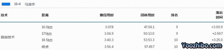 第4棒马清华在16公里计时点耗时47分06秒1,反超意大利47分06秒9夺回第9,但落后头名德国有3分00秒9,行进至17.5公里成绩是50分13秒0依然是排名第9,不过与第10意大利50分13秒5竞争惨烈。马清华在18.5公里计时点是耗时53分53秒跌至第10,最终冲刺成绩是57分49秒7名列第10收官,打破在1984年萨拉热窝冬奥会历史最好成绩。