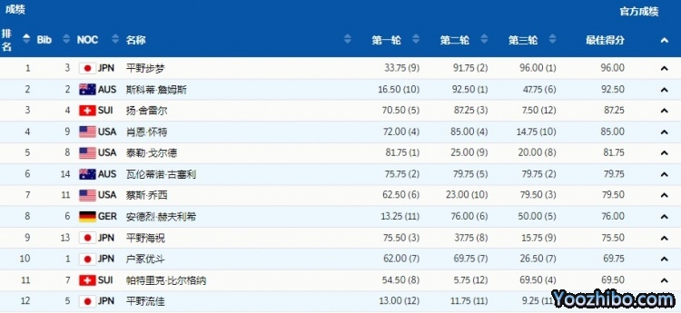 平野步梦第二轮还落后于斯科蒂-詹姆斯,最后一滑,他以完美的表现获得96分的高分绝杀夺金。