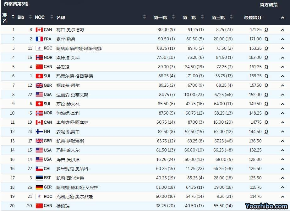关键的第三轮,谷爱凌出场,在她之前出场的两名夺冠热门都出现了严重失误,而谷爱凌顶住巨大压力,跳出72.25分,这样她也再一次回到了晋级区,随着新西兰选手哈克特最后一跳结束,谷爱凌也锁定了晋级席位!而杨硕瑞第三跳拿到55.50分,成绩最好两轮相加已经确定跌出晋级区,最终,谷爱凌晋级决赛,而带伤出战的杨硕瑞获得第20名,遗憾出局。