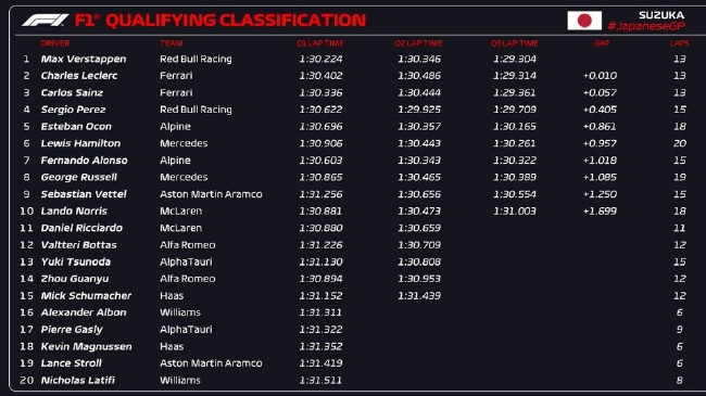 优直播讯 北京时间10月08日,2022年F1日本大奖赛排位赛结束,凭借Q3第一个飞驰圈的出色发挥,红牛车队维斯塔潘顺利拿到日本大奖赛的杆位!法拉利车队勒克莱尔和塞恩斯两位法拉利车手分列第二和第三。