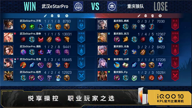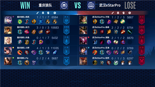 双方常规开局。2分16秒武汉eStar拿下暴君。2分30秒武汉eStar关羽单杀鲁班大师拿到一血。2分43秒武汉eStar对抗路关羽送塔。3分06秒重庆狼队发育路击杀公孙离。3分41秒重庆狼队摧毁敌方发育路外塔。5分08秒重庆狼队发育路露娜单杀娜可露露。5分40秒重庆狼队摧毁敌方中路外塔。10分16秒重庆狼队拿下暗影暴君。11分04秒重庆狼队拿下暗影主宰。11分51秒重庆狼队野区打出0换2。13分07秒双方野区2换2,重庆狼队摧毁敌方中路高地塔。14分56秒重庆狼队对抗路击杀娜可露露。15分47秒高地团战武汉eStar击杀蒙恬。16分12秒武汉eStar拿下暗影主宰。16分30秒武汉eStar对抗路击杀后羿。18分15秒野区团战武汉eStar打出0换2。18分42秒武汉eStar拿下暗影暴君。20分27秒野区团战武汉eStar打出1换5。20分50秒武汉eStar摧毁敌方水晶拿下比赛。