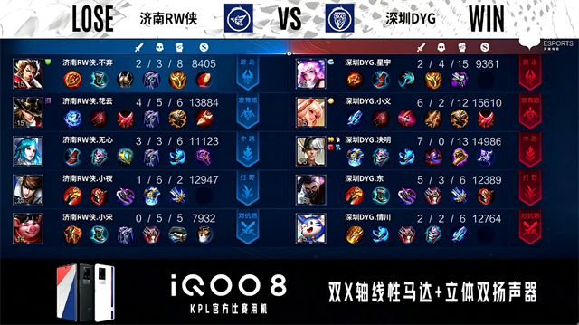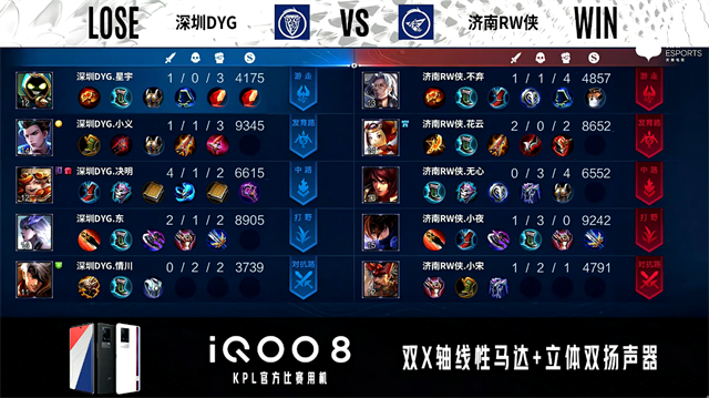 开局济南RW侠孙尚香中路抢线。44秒济南RW侠发育路击杀盾山拿到一血。2分24秒济南RW侠拿下暴君,深圳DYG拿下主宰。5分32秒深圳DYG中路击杀云缨。6分25秒深圳DYG反掉蓝BUFF。6分54秒双方边路互换外塔。7分21秒深圳DYG发育路击杀孙尚香。7分31秒深圳DYG拿下暴君。8分39秒济南RW侠反掉蓝BUFF。8分59秒深圳DYG摧毁敌方中路外塔。9分24秒深圳DYG拿下主宰。10分19秒深圳DYG拿下暗影暴君。11分48秒深圳DYG摧毁敌方中路二塔。12分02秒济南RW侠发育路击杀娜可露露。12分33秒济南RW侠拿下主宰。12分39秒深圳DYG野区击杀关羽。13分21秒深圳DYG摧毁敌方发育路高地塔。13分54秒济南RW侠摧毁敌方中路外塔。14分39秒深圳DYG中路击杀西施。15分04秒深圳DYG拿下暗影暴君。15分46秒深圳DYG对抗路击杀太乙真人。16分26秒济南RW侠对抗路团战打出1换2。16分58秒济南RW侠拿下暗影主宰。19分24秒深圳DYG拿下暗影暴君。20分32秒中路团战深圳DYG打出0换2。21分36秒深圳DYG摧毁水晶拿下比赛。