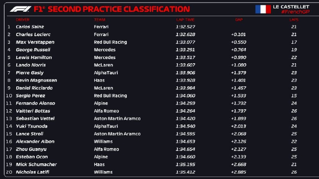 优直播讯 北京时间07月23日,2022年F1法国大奖赛第2次练习赛在保罗-里卡德赛道结束。法拉利车手包揽了圈速前两位,塞恩斯最终以1:32.527排名第一,勒克莱尔落后0.101秒排名第二,红牛车队维斯塔潘落后0.550秒排名第三,拉塞尔和汉密尔顿分列四五。排名六至十位的车手分别是诺里斯、加斯利、马格努森、里卡多、佩雷兹。中国车手周冠宇名列第17位。