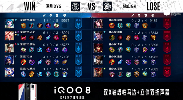 2分29秒,暴君团,双方1换1,深圳DYG拿到暴君。4分05秒,深圳DYG下路越塔击杀狄仁杰。6分12秒,双方两处交火,深圳DYG打出1换3,橘右京拿下双杀。8分26秒,佛山GK破掉深圳DYG上一塔。10分18秒,深圳DYG控下暗影暴君。11分10秒,佛山GK破掉深圳DYG下一塔。11分47秒,深圳DYG控下暗影主宰。12分22秒,深圳DYG三人中路强拆掉佛山GK中一塔。12分50秒,佛山GK大乔传大强拆掉深圳DYG下二塔。14分25秒,河道团,双方1换1,随后深圳DYG破掉佛山GK中、上二塔。14分52秒,深圳DYG控下暗影暴君。15分42秒,佛山GK上路击杀蔡文姬。16分36秒,深圳DYG控下暗影主宰。19分03秒,深圳DYG控下暗影暴君。20分30秒,野区团,深圳DYG击杀狄仁杰,随后破掉佛山GK中、上高地。21分23秒,双方团,深圳DYG击杀廉颇。21分57秒,深圳DYG控下风暴龙王,随后破掉佛山GK下高地。22分50秒,高地团,深圳DYG打出0换4,随后一波推掉佛山GK水晶先下一城。