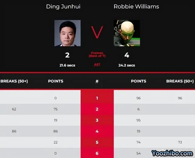 优直播讯 9月29日,2022斯诺克英国公开赛32进16的比赛,中国选手丁俊晖迎战罗比-威廉姆斯,丁俊晖没有长台,所以想要拿到上手机会,只能等对手失误,最终罗比-威廉姆斯以4-2获胜。