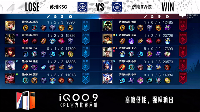 2分28秒,苏州KSG控下暴君。3分50秒,济南RW侠控下先知主宰。4分钟,苏州KSG破掉济南RW侠下一塔。6分33秒,苏州KSG公孙离击杀吕布拿下一血。7分27秒,苏州KSG控下暴君。8分16秒,中路团,双方2换2。9分15秒,苏州KSG控下先知主宰。10分17秒,苏州KSG控下暗影暴君。10分37秒,苏州KSG破掉济南RW侠上一塔。10分51秒,苏州KSG破掉济南RW侠下二塔。11分06秒,苏州KSG击杀云缨。11分30秒,苏州KSG破掉济南RW侠上二塔。12分35秒,双方团,济南RW侠打出0换2。12分57秒,济南RW侠控下暗影主宰。14分钟,双方团战1换1。14分20秒,上路团,苏州KSG打出0换3。15分08秒,苏州KSG控下暗影暴君。16分06秒,苏州KSG破掉济南RW侠中二塔。16分58秒,苏州KSG控下暗影主宰。18分47秒,双方团,济南RW侠打出1换3。19分22秒,济南RW侠控下暗影暴君。22分22秒,双方团,苏州KSG打出0换2。22分56秒,苏州KSG控下风暴龙王。24分06秒,苏州KSG破掉济南RW侠上、下二塔,济南RW侠中路打出0换2。24分55秒,济南RW侠破掉苏州KSG中高地。25分10秒,苏州KSG击杀云缨。25分54秒,苏州KSG破掉济南RW侠中高地。27分10秒,苏州KSG控下风暴龙王。31分30秒,济南RW侠团战打出0换2,随后控下风暴龙王。32分13秒,济南RW侠团灭对手,随后一波摧毁苏州KSG水晶率先拿到赛点。