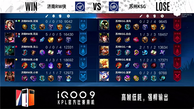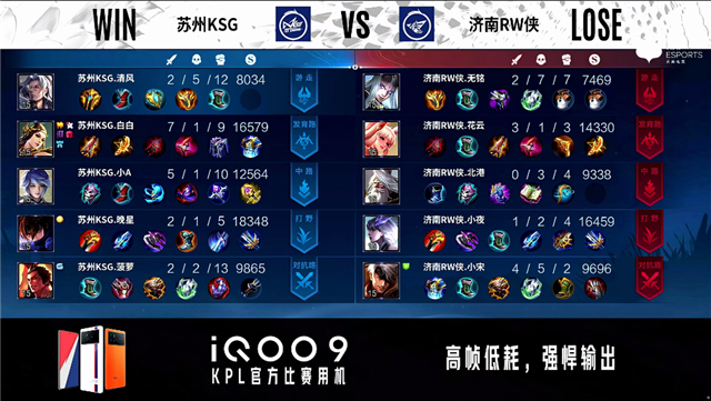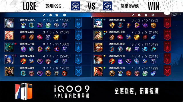 3分31秒,济南RW侠控下暴君,随后苏州KSG控下先知主宰。4分37秒,济南RW侠破掉苏州KSG下一塔。5分45秒,济南RW侠破掉苏州KSG上一塔。7分48秒,苏州KSG控下暴君,随后济南RW侠控下先知主宰。10分37秒,济南RW侠李元芳抢到暗影暴君,随后团战济南RW侠打出1换3。11分03秒,济南RW侠破掉苏州KSG中路两座外塔。11分23秒,济南RW侠破掉苏州KSG下高地。12分54秒,济南RW侠击杀盘古。13分25秒,中路团战双方1换1,随后破掉苏州KSG中高地。15分37秒,济南RW侠控下暗影主宰。15分40秒,双方团战1换1。18分47秒,济南RW侠控下暗影主宰。19分12秒,济南RW侠控下暗影暴君。23分10秒,济南RW侠控下风暴龙王,随后团战济南RW侠打出1换4,李元芳拿下三杀。23分53秒,济南RW侠摧毁苏州KSG水晶赢下比赛。