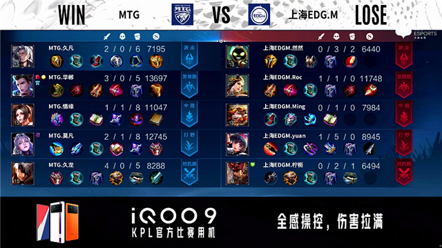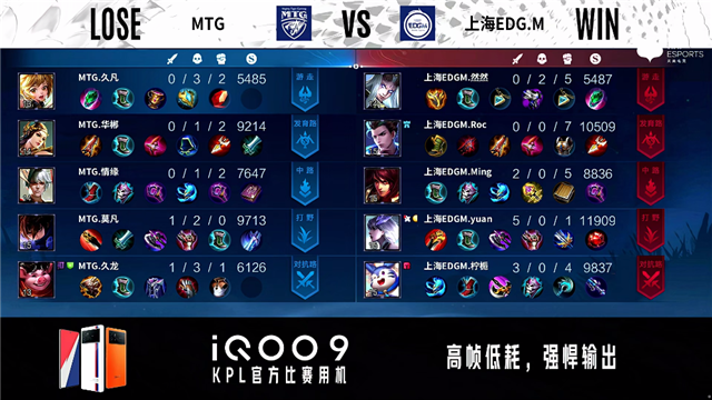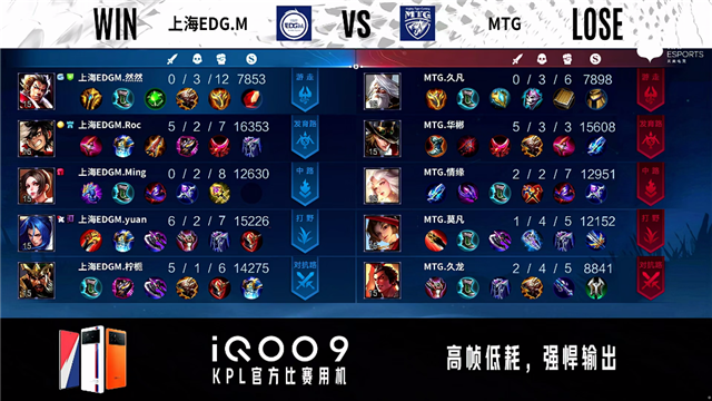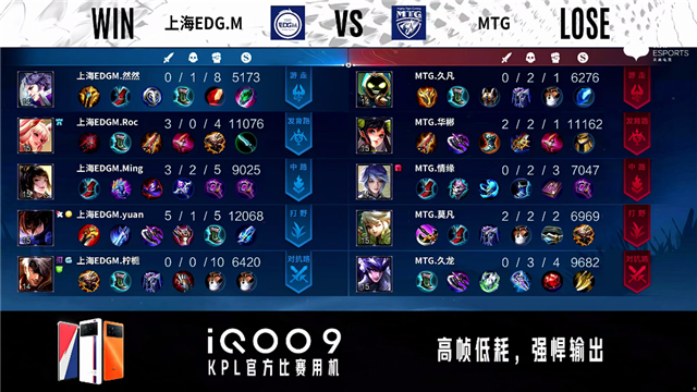 2分14秒,上海EDG.M镜击杀孙膑拿下一血。2分40秒,上海EDG.M控下暴君。5分08秒,上海EDG.M破掉MTG下一塔。5分26秒,上海EDG.M控下先知主宰。5分45秒,MTG破掉上海EDG.M下一塔,随后上海EDG.M破掉MTG上一塔。6分23秒,双方团战1换1。7分钟,上海EDG.M控下暴君。7分59秒,上海EDG.M破掉MTG上二塔。6分30秒,MTG击杀东皇太一。9分39秒,上海EDG.M控下先知主宰。9分 54秒,中路团,上海EDG.M打出0换2,随后破掉MTG中一塔。10分37秒,MTG控下暗影主宰。11分12秒,上海EDG.M击杀澜,随后破掉上海EDG.M中二塔。12分02秒,上海EDG.M破掉MTG上高地。12分37秒,上海EDG.M控下暗影暴君。12分57秒,上海EDG.M破掉MTG下高地,随后再破掉上海EDG.M中高地。13分47秒,双方团,上海EDG.M打出0换5团灭对手。14分07秒,上海EDG.M中路一波摧毁MTG水晶赢下比赛。