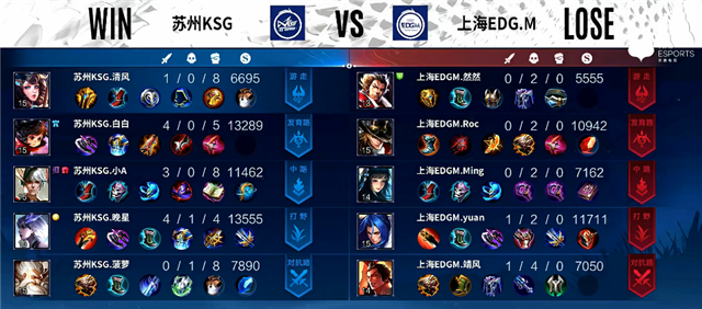 2分24秒中路团,镜拿下一血。3分13秒镜拿下暴君。4分12秒李元芳推掉下路一塔。5分钟橘右京拿下主宰。7分钟橘右京推掉下路一塔。8分钟镜拿下暴君。9分13秒嬴政拿下主宰。10分27秒镜拿下主宰。12分钟镜拿下暴君。13分10秒中路团战,苏州KSG打出0换2。13分37秒嬴政推掉中路一塔。14分20秒镜拿下主宰。15分40秒李元芳推掉推掉下路高地塔,团战团灭上海EDG.M。16分16秒苏州KSG推掉水晶率先拿下赛点。