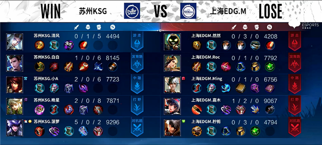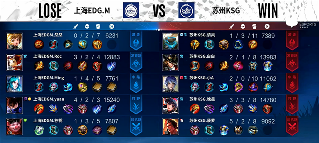 3分钟澜拿下暴君。4分钟上路团战,吕布拿下一血。5分钟娜可露露拿下主宰。5分50秒鲁班七号推掉下路一塔。7分钟澜拿下暴君。7分30秒中路团战,吕布被击杀。9分钟澜拿下暴君,娜可露露拿下主宰。10分20秒野区团战,上海EDG.M打出1换3。13分10秒河道团战,盾山被击杀。14分20秒娜可露露拿下暴君。14分30秒澜拿下主宰。15分20秒中路团战,苏州KSG打出2换4。17分20秒中路团战,苏州KSG团灭上海EDG.M。18分12秒苏州KSG推掉水晶拿下本场比赛胜利。