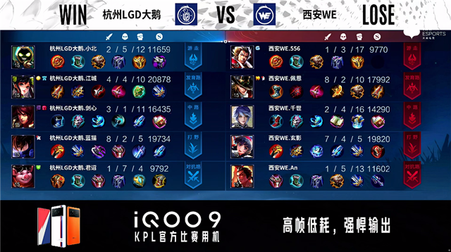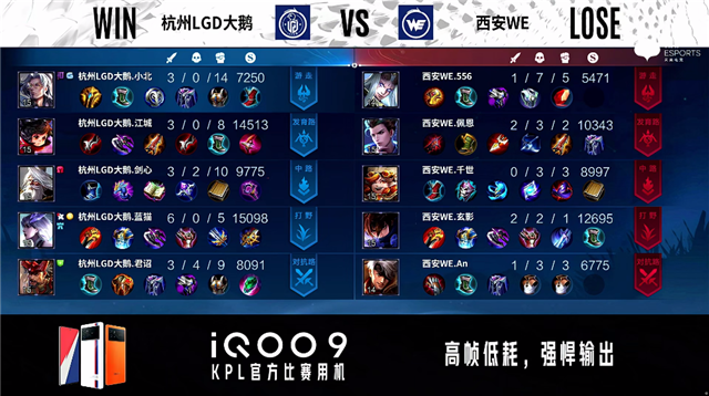 58秒,西安WE狂铁击杀入侵野区的橘右京拿下一血。1分15秒,杭州LGD大鹅蒙恬击杀狂铁。2分36秒,杭州LGD大鹅控下暴君。3分34秒,下路团战双方1换1。5分39秒,杭州LGD大鹅破掉西安WE下一塔。6分36秒,杭州LGD大鹅破掉西安WE中一塔并打出0换2。10分12秒,杭州LGD大鹅控下暗影暴君,随后团战杭州LGD大鹅打出2换4,鲁班七号拿下三杀。11分钟,杭州LGD大鹅破掉西安WE下二塔及下高地。11分40秒,野区团,杭州LGD大鹅击杀上官婉儿,随后破掉西安WE上二塔。12分10秒,杭州LGD大鹅破掉西安WE中二塔,随后破掉西安WE上高地及中高地。13分钟,西安WE击杀鲁班七号。13分35秒,西安WE控下暗影主宰。14分05秒,杭州LGD大鹅控下暗影暴君。17分34秒,杭州LGD大鹅控下暗影主宰。16分钟,杭州LGD大鹅控下暗影暴君,随后团战打出0换4。16分32秒,杭州LGD大鹅摧毁西安WE水晶赢下比赛。