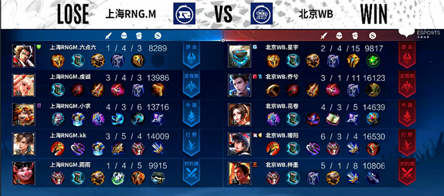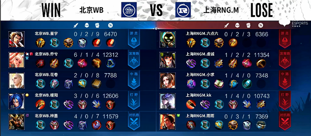 2分13秒公孙离拿下暴君,镜拿下主宰。2分30秒下路团战,不知火舞拿下一血,双方1换1。3分钟上路团战,北京WB打出0换2。4分45秒公孙离推掉下路一塔。5分20秒野区团战,北京WB打出0换3,上海RNG.M中路一塔被破。6分40秒橘右京拿下暴君。8分10秒橘右京拿下主宰。9分钟上路团战,北京WB打出0换2。10分27秒橘右京拿下暴君。11分钟橘右京拿下主宰。12分22秒上海RNG.M中路高地塔被破。12分50秒不知火舞被击杀。13分26秒公孙离被击杀。14分钟橘右京拿下暴君。14分46秒橘右京拿下主宰。15分钟公孙离推掉上路高地塔。15分34秒北京WB推掉水晶拿下本场比赛胜利。