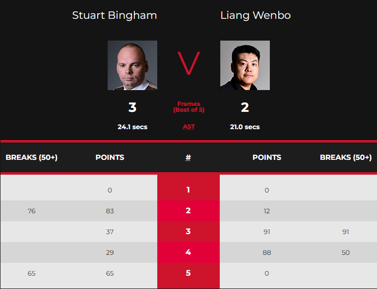 梁文博与宾汉姆总共有12次交锋记录,战绩为7胜5负,略占优势。双方在小组循环赛第五轮刚刚有过交锋,梁文博3-0轻松战胜对手。三局比赛,梁文博58-2、60-48、123-5。来到冠军联赛冠军半决赛的角逐,梁文博没能延续小组循环赛对阵宾汉姆时的状态,2-3输给对手。